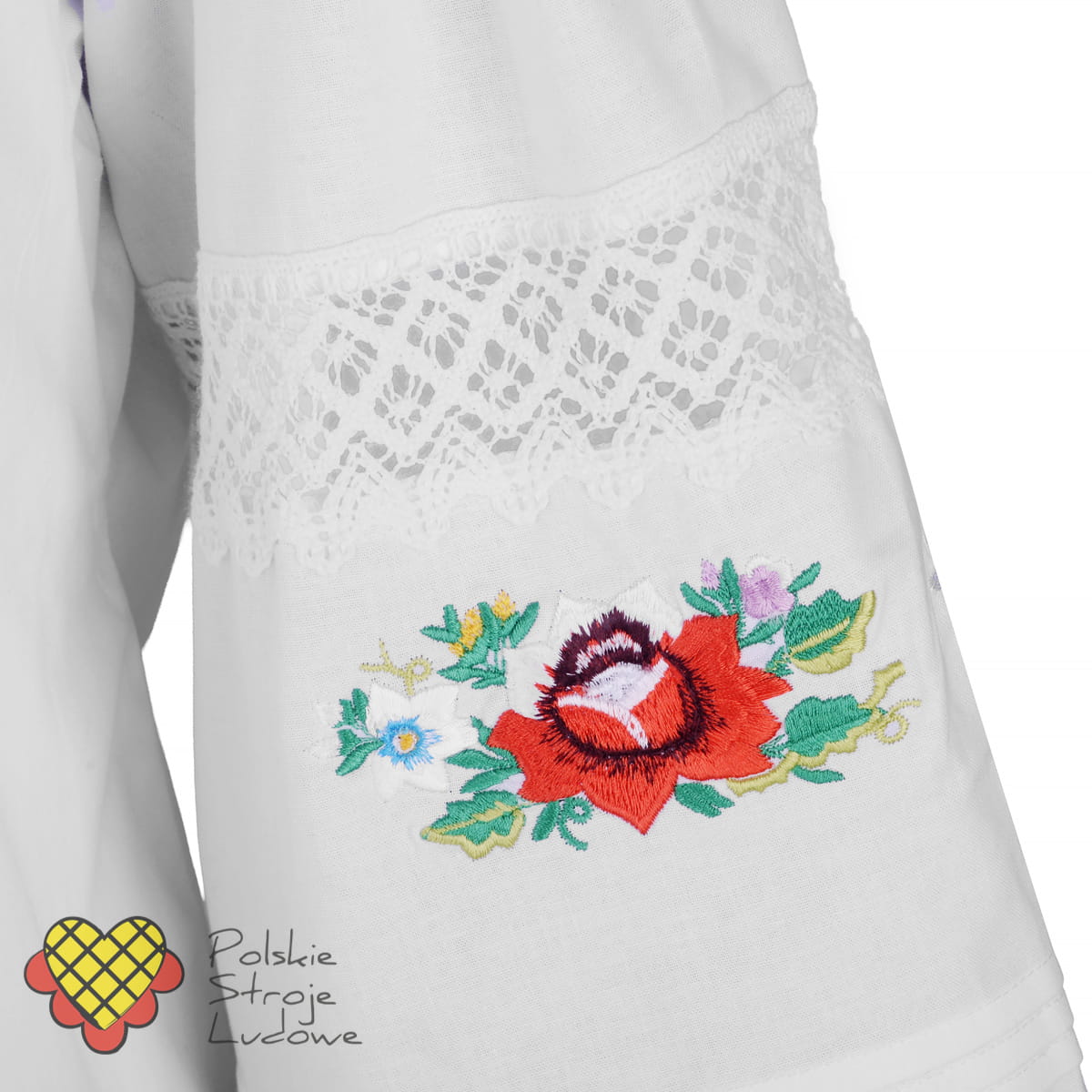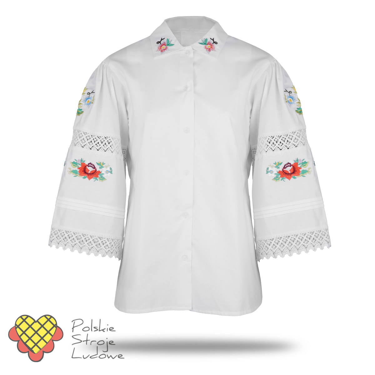 Zapinana na białe guziki, z pięknym, tradycyjnym haftem łowickim na szerokich rękawach i kołnierzu.